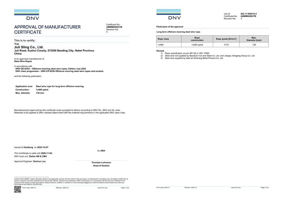 2020年11月,巨力索具取得了永久系泊用單股涂塑鋼絲繩的DNV·GL工廠認可證書,成為國內首家通過該類鋼絲繩DNV·GL工廠認可的廠家。