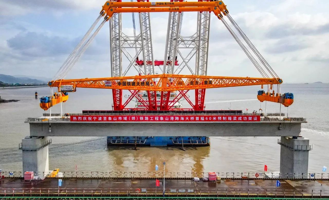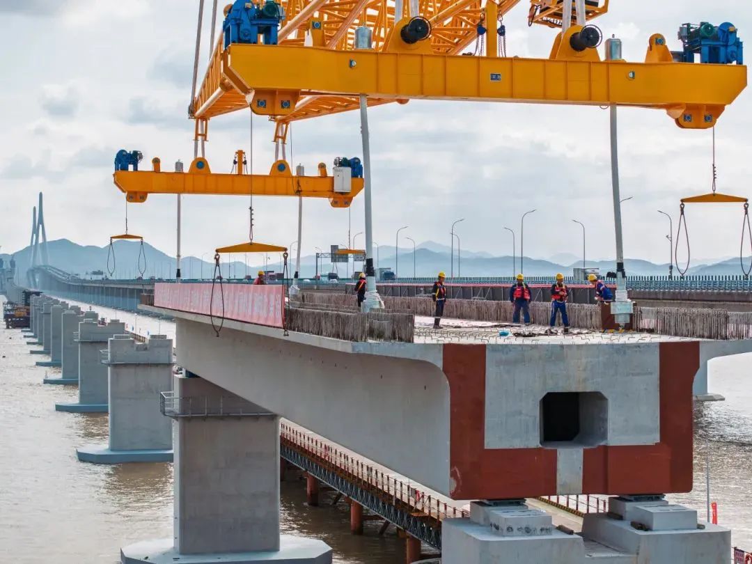 11月5日,隨著現(xiàn)場指揮一聲令下,國內(nèi)首座市域(郊)鐵路跨海大橋,重1700噸的預(yù)制箱梁穩(wěn)穩(wěn)落至橋墩上,巨力索具箱梁吊具全程保障首榀箱梁成功架設(shè),標(biāo)志著大橋全面進(jìn)入上部結(jié)構(gòu)施工階段。