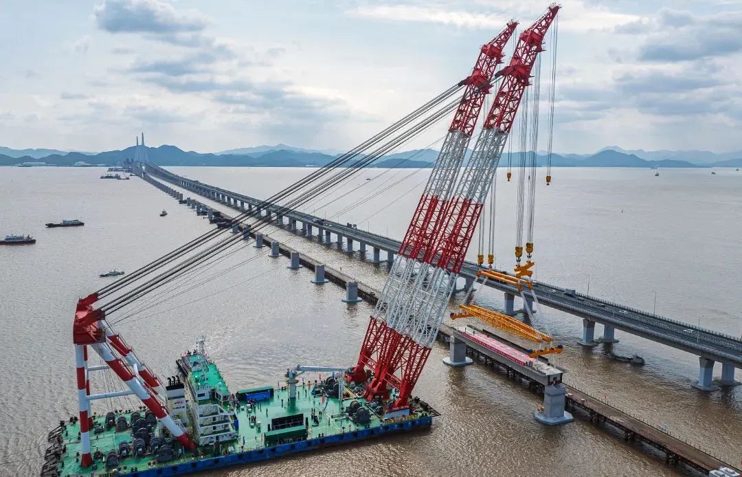 大橋海上架設(shè)預(yù)制箱梁共66榀,每榀梁長60米,寬10.6米,重約1700噸,吊具重280噸,總體起吊總重1980噸,是國內(nèi)市域(郊)鐵路工程跨度最大、噸位最重的預(yù)應(yīng)力混凝土預(yù)制箱梁。