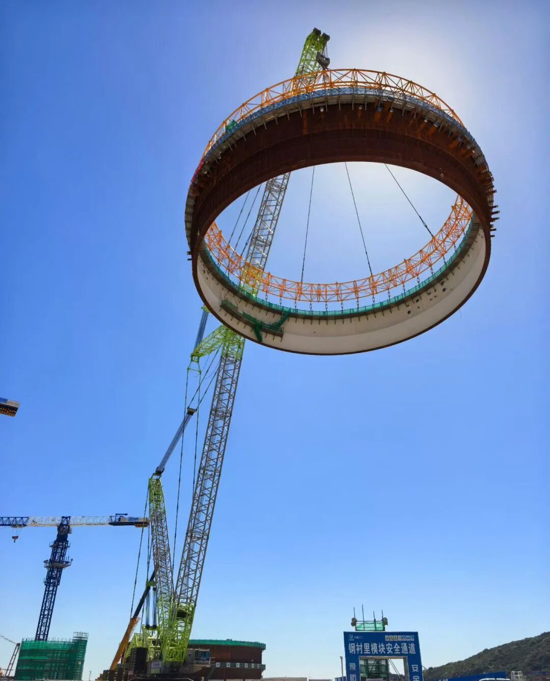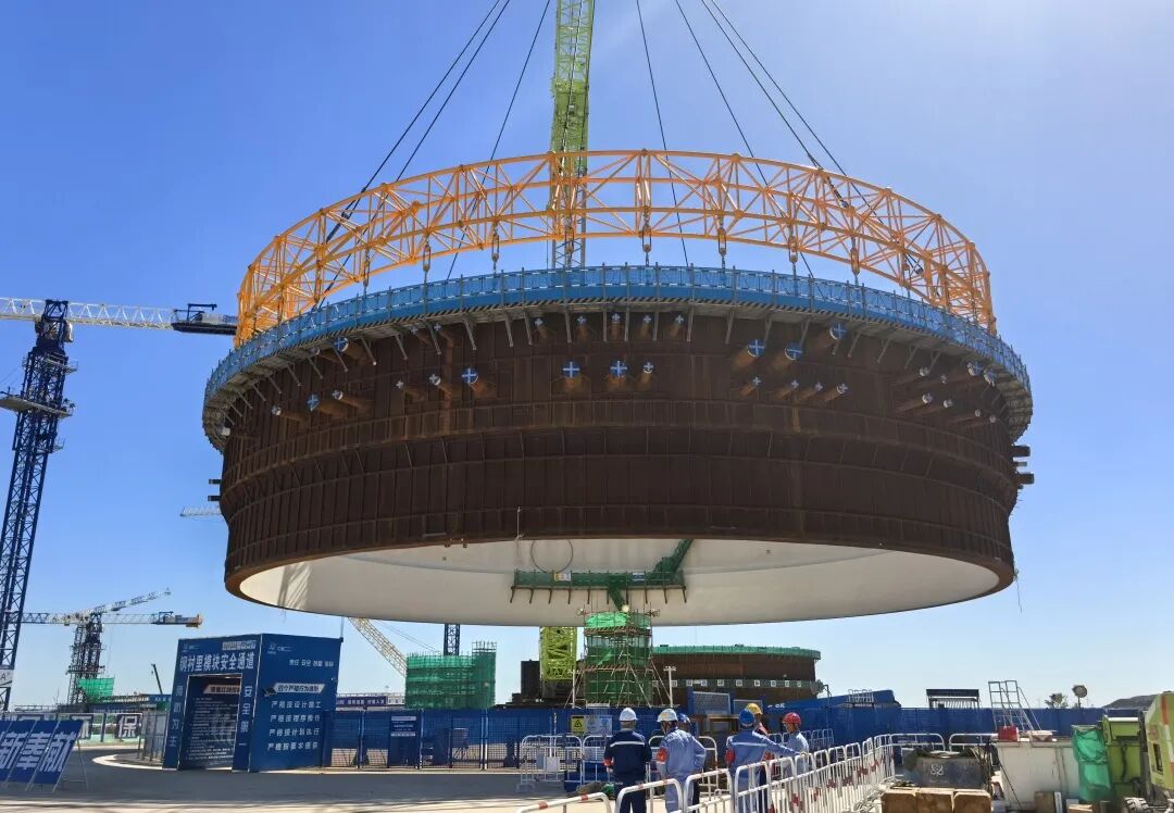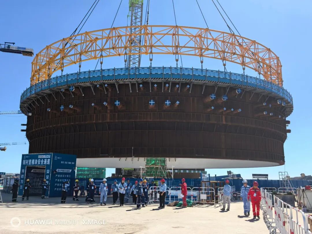 9月28日,金七門核電1號機組鋼結構安全殼鋼襯里模塊一平穩落位,首個大型模塊吊裝任務圓滿完成。此次吊裝采用了以巨力索具環形吊具為代表的先進吊裝技術,實現了安全精準的吊裝作業。