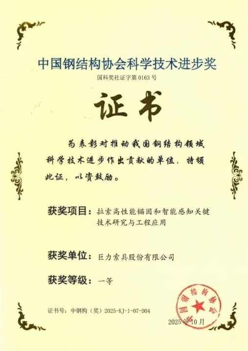 近日,2025年度中國鋼結(jié)構(gòu)協(xié)會(huì)科學(xué)技術(shù)進(jìn)步獎(jiǎng)評審結(jié)果揭曉。在10月14日于廣西南寧舉行的頒獎(jiǎng)典禮上,巨力索具股份有限公司憑借卓越的技術(shù)研發(fā)實(shí)力,一舉斬獲三項(xiàng)一等獎(jiǎng),充分彰顯了公司在高端索具技術(shù)領(lǐng)域的創(chuàng)新引領(lǐng)地位。