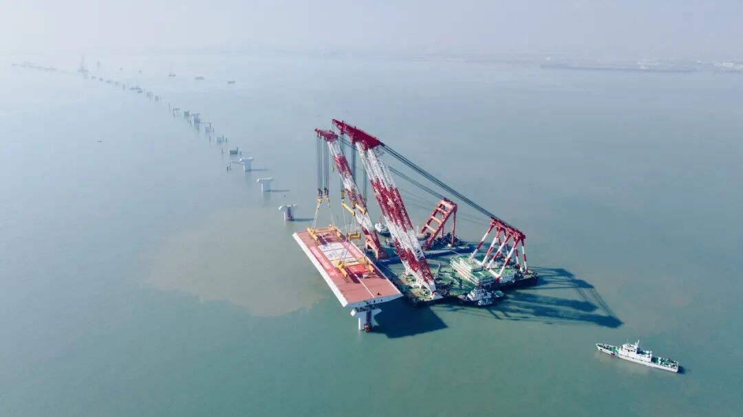 廈金大橋(廈門段)總長約19.6公里,本次吊裝的鋼箱梁位于大嶝西航道橋東側的90-91號墩,梁長142.5米、寬44米、高4.5米,總重量4586噸,堪稱“海上巨無霸”。該梁段的成功架設,刷新了海上裝配式橋梁整孔架設鋼梁的重量記錄,也為行業內淺灘海域“智能裝配化”造橋提供了重要實踐。