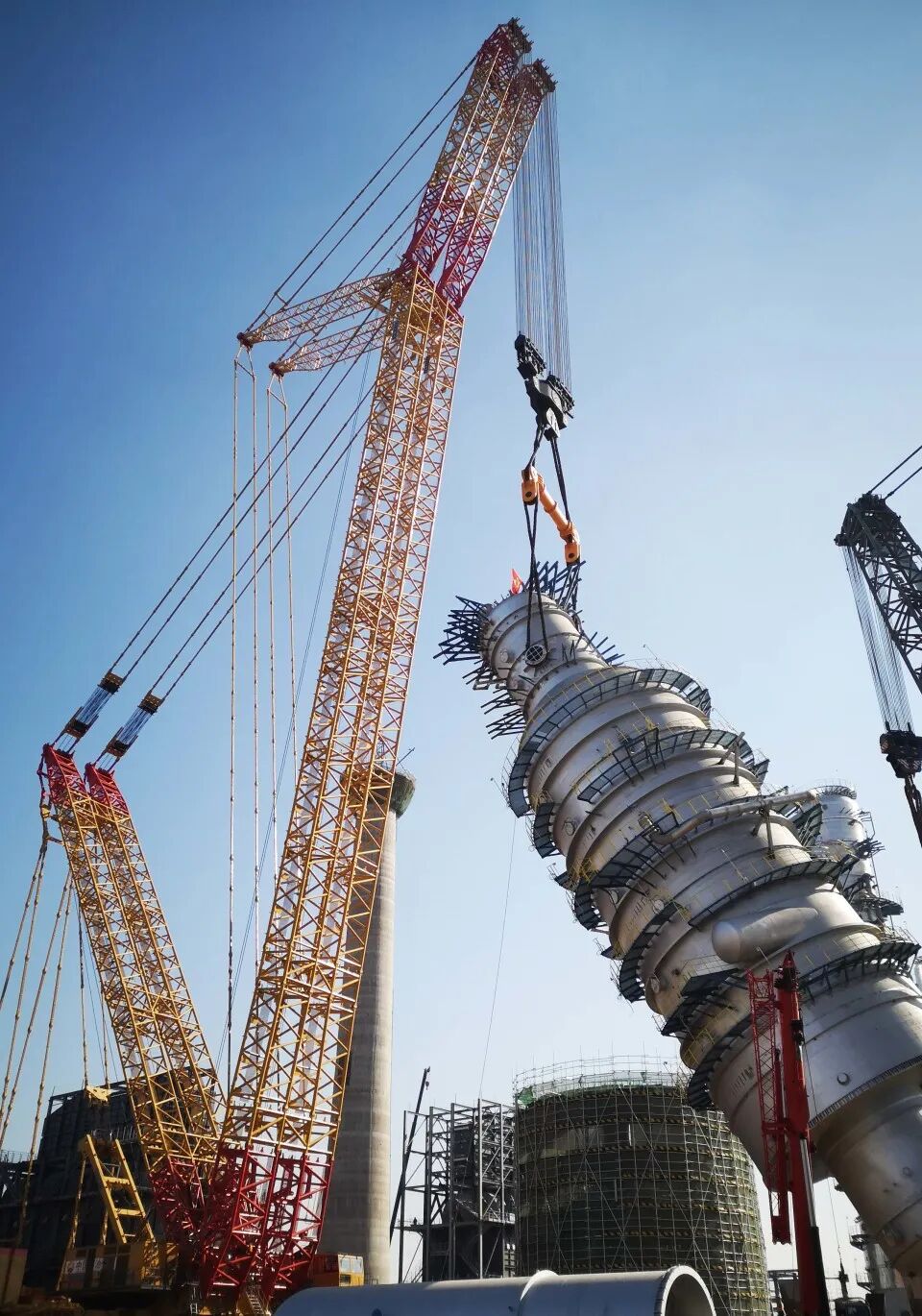巨力索具的2000t級(jí)平衡梁、無接頭繩圈,將盛虹煉化一體化項(xiàng)目常減壓蒸餾裝置中直徑14米,高58米,吊重1717噸的減壓塔順利吊裝就位。