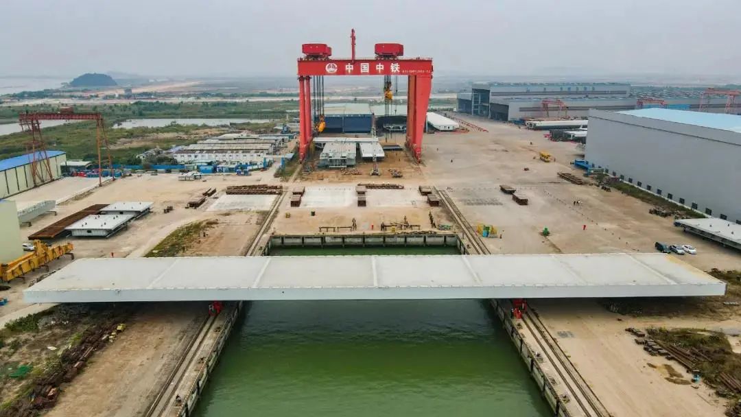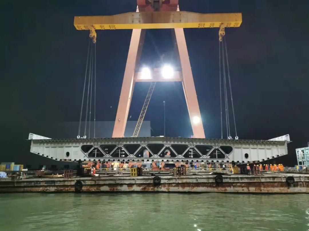 深中通道G05標段泄洪區(qū)及淺灘區(qū)鋼箱梁大節(jié)段XG9L的出海平臺方案為世界首創(chuàng)的出海運輸方案,整個運輸過程使用8臺模塊車,4臺移梁平車,頂升運載能力可達2000噸。經(jīng)過三次頂升及運輸,將鋼箱梁大節(jié)段XG9L從存梁區(qū)運至待裝船區(qū),由世界第二起重能力的“天一號”運架一體船將鋼箱梁吊運至橋址。